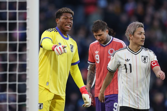 Zion Suzuki ketika bermain di laga Skotlandia vs Jepang, Minggu (29/03/2026). (c) AP Photo/Scott Heppell.